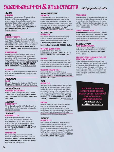 Queeres Leben 1. Juni 2024Jugendgruppen & Studitreffs milchjugend.ch/treffs Bist du Mitglied oder Leiter*in einer queeren Jugend- oder Studigruppe? Oder würdest du gern eine gründen? dann melde dich: info@milchjugend.ch