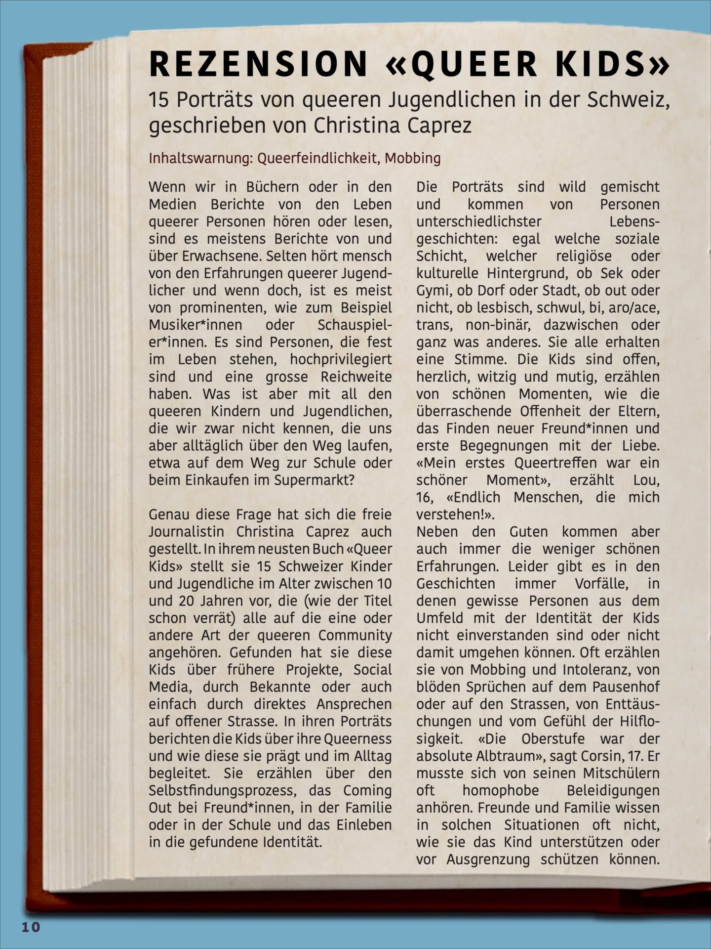 Beim Lesen des Buches war ich immer wieder erstaunt darüber, wie gut Christina Caprez die Stimmen der Kids zur Geltung bringt. Oft hatte ich das Gefühl, dass die Kids mir direkt gegenübersassen, ich konnte mich leicht in ihre Lage hineinversetzen und sie gut verstehen. Die Interviews mit den Fachpersonen runden die Gespräche mit den Jugendlichen ab und beantworten viele offene Fragen. Sie zeigen auf, wie wichtig es ist, dass Queerness im Alltag sichtbar und zugänglich ist und dass die Verantwortung dafür bei den Erzieher*innen liegt. Ich empfehle dieses Buch deshalb sehr an Lehrpersonen, die das Thema gerne in der Schule besprechen würden, aber nicht sicher sind, wie sie das tun sollten. Auch für das Umfeld von queeren Kids enthält das Buch wertvolle Erfahrungen und kann helfen, die Lage der Kinder zu verstehen und besser damit umzugehen.