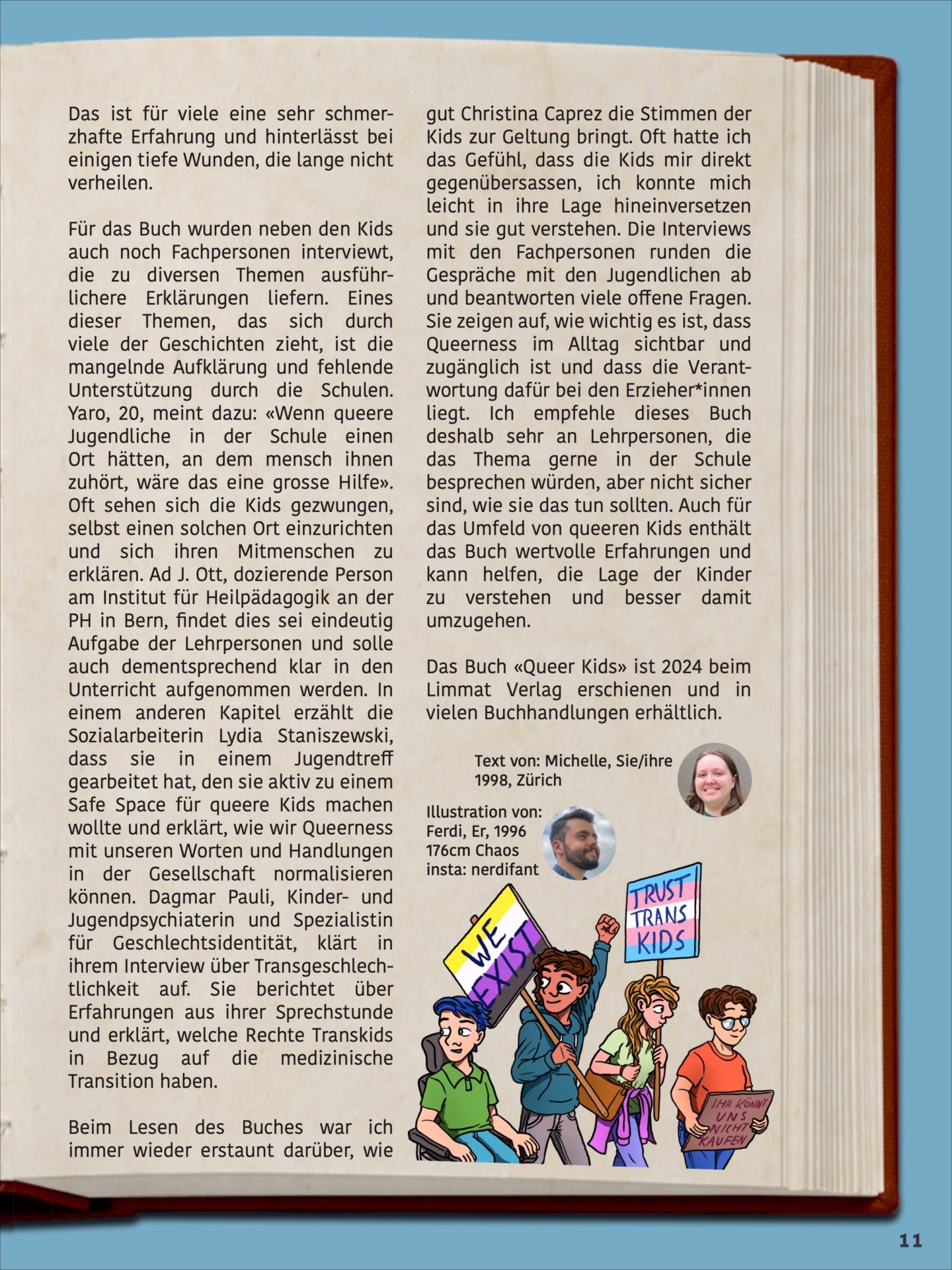 Für das Buch wurden neben den Kids auch noch Fachpersonen interviewt, die zu diversen Themen ausführlichere Erklärungen liefern. Eines dieser Themen, das sich durch viele der Geschichten zieht, ist die mangelnde Aufklärung und fehlende Unterstützung durch die Schulen. Yaro, 20, meint dazu: «Wenn queere Jugendliche in der Schule einen Ort hätten, an dem mensch ihnen zuhört, wäre das eine grosse Hilfe». Oft sehen sich die Kids gezwungen, selbst einen solchen Ort einzurichten und sich ihren Mitmenschen zu erklären. Ad J. Ott, dozierende Person am Institut für Heilpädagogik an der PH in Bern, findet dies sei eindeutig Aufgabe der Lehrpersonen und solle auch dementsprechend klar in den Unterricht aufgenommen werden. In einem anderen Kapitel erzählt die Sozialarbeiterin Lydia Staniszewski, dass sie in einem Jugendtreff gearbeitet hat, den sie aktiv zu einem Safe Space für queere Kids machen wollte und erklärt, wie wir Queerness mit unseren Worten und Handlungen in der Gesellschaft normalisieren können. Dagmar Pauli, Kinder- und Jugendpsychiaterin und Spezialistin für Geschlechtsidentität, klärt in ihrem Interview über Transgeschlechtlichkeit auf. Sie berichtet über Erfahrungen aus ihrer Sprechstunde und erklärt, welche Rechte Transkids in Bezug auf die medizinische Transition haben.