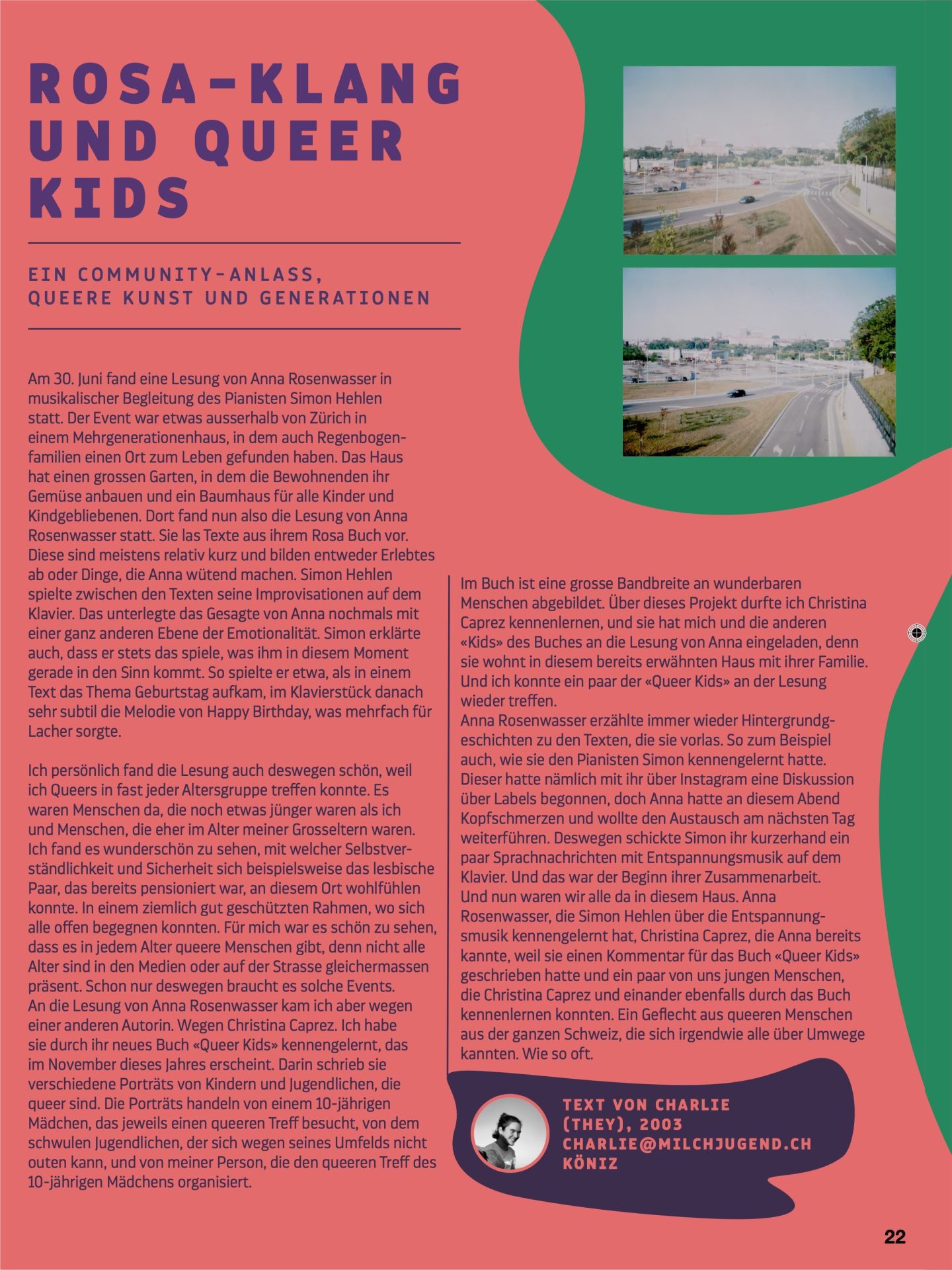 Ich persönlich fand die Lesung auch deswegen schön, weil ich Queers in fast jeder Altersgruppe treffen konnte. Es waren Menschen da, die noch etwas jünger waren als ich und Menschen, die eher im Alter meiner Grosseltern waren. Ich fand es wunderschön zu sehen, mit welcher Selbstverständlichkeit und Sicherheit sich beispielsweise das lesbische Paar, das bereits pensioniert war, an diesem Ort wohlfühlen konnte. In einem ziemlich gut geschützten Rahmen, wo sich alle offen begegnen konnten. Für mich war es schön zu sehen, dass es in jedem Alter queere Menschen gibt, denn nicht alle Alter sind in den Medien oder auf der Strasse gleichermassen präsent. Schon nur deswegen braucht es solche Events. An die Lesung von Anna Rosenwasser kam ich aber wegen einer anderen Autorin. Wegen Christina Caprez. Ich habe sie durch ihr neues Buch «Queer Kids» kennengelernt, das im November dieses Jahres erscheint. Darin schrieb sie verschiedene Porträts von Kindern und Jugendlichen, die queer sind. Die Porträts handeln von einem 10-jährigen Mädchen, das jeweils einen queeren Treff besucht, von dem schwulen Jugendlichen, der sich wegen seines Umfelds nicht outen kann, und von meiner Person, die den queeren Treff des 10-jährigen Mädchens organisiert.