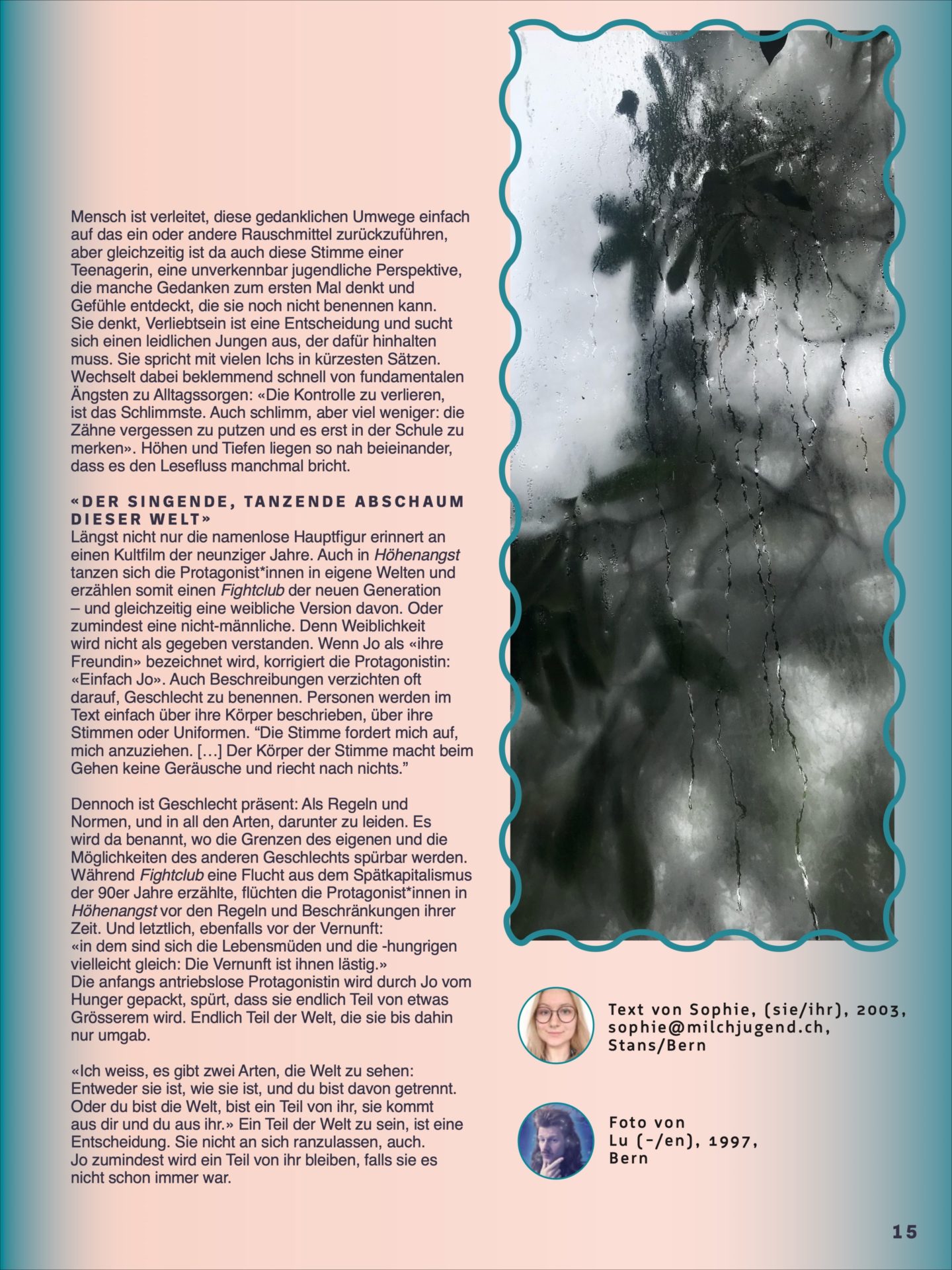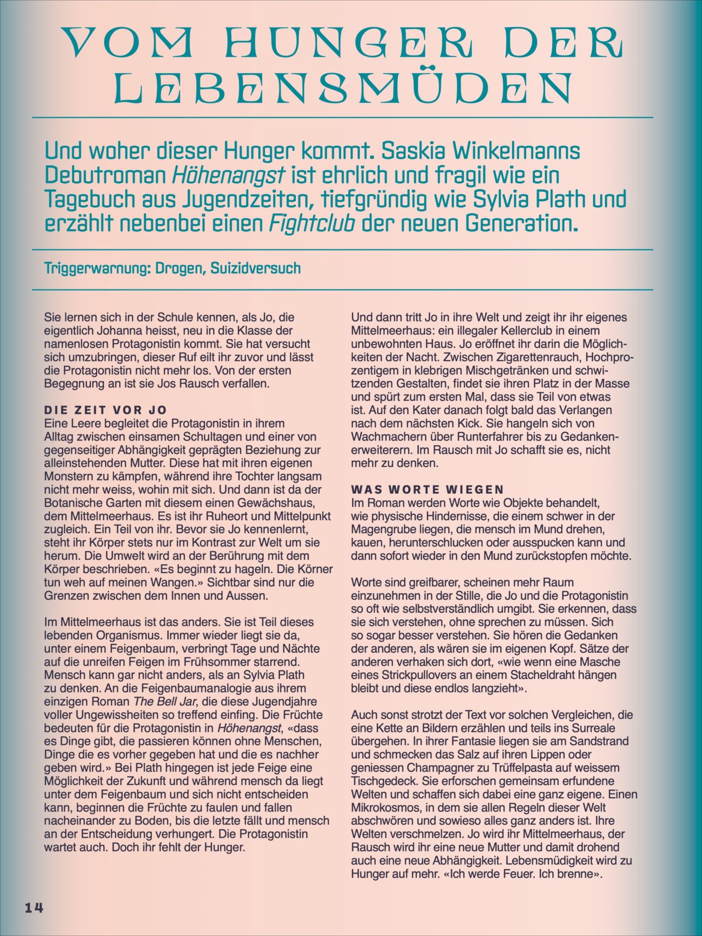 Längst nicht nur die namenlose Hauptfigur erinnert an einen Kultfilm der neunziger Jahre. Auch in Höhenangst tanzen sich die Protagonist*innen in eigene Welten und erzählen somit einen Fightclub der neuen Generation – und gleichzeitig eine weibliche Version davon. Oder zumindest eine nicht-männliche. Denn Weiblichkeit wird nicht als gegeben verstanden. Wenn Jo als «ihre Freundin» bezeichnet wird, korrigiert die Protagonistin: «Einfach Jo». Auch Beschreibungen verzichten oft darauf, Geschlecht zu benennen. Personen werden im Text einfach über ihre Körper beschrieben, über ihre Stimmen oder Uniformen. “Die Stimme fordert mich auf, mich anzuziehen. […] Der Körper der Stimme macht beim Gehen keine Geräusche und riecht nach nichts.” Dennoch ist Geschlecht präsent: Als Regeln und Normen, und in all den Arten, darunter zu leiden. Es wird da benannt, wo die Grenzen des eigenen und die Möglichkeiten des anderen Geschlechts spürbar werden. Während Fightclub eine Flucht aus dem Spätkapitalismus der 90er Jahre erzählte, flüchten die Protagonist*innen in Höhenangst vor den Regeln und Beschränkungen ihrer Zeit. Und letztlich, ebenfalls vor der Vernunft: «in dem sind sich die Lebensmüden und die -hungrigen vielleicht gleich: Die Vernunft ist ihnen lästig.» Die anfangs antriebslose Protagonistin wird durch Jo vom Hunger gepackt, spürt, dass sie endlich Teil von etwas Grösserem wird. Endlich Teil der Welt, die sie bis dahin nur umgab. «Ich weiss, es gibt zwei Arten, die Welt zu sehen: Entweder sie ist, wie sie ist, und du bist davon getrennt. Oder du bist die Welt, bist ein Teil von ihr, sie kommt aus dir und du aus ihr.» Ein Teil der Welt zu sein, ist eine Entscheidung. Sie nicht an sich ranzulassen, auch. Jo zumindest wird ein Teil von ihr bleiben, falls sie es nicht schon immer war.