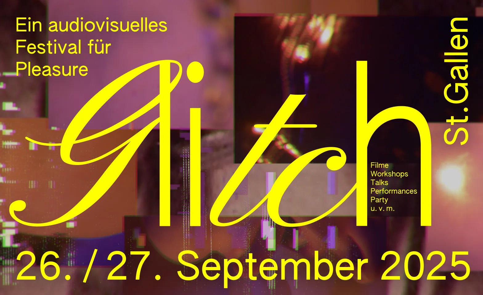 Am 26. und 27. September 2025 vereint Glitch Künstler:innen, Kulturschaffende und Besucher:innen. Zusammen erleben wir ein sinnliches Programm, das zum Nachdenken, Anecken und Mitgestalten einlädt.