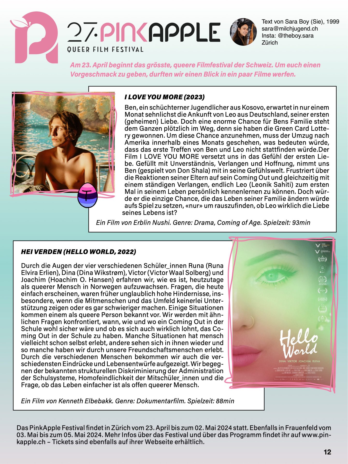 Das PinkApple Festival findet in Zürich vom 23. April bis zum 02. Mai 2024 statt. Ebenfalls in Frauenfeld vom 03. Mai bis zum 05. Mai 2024. Mehr Infos über das Festival und über das Programm findet ihr auf www.pinkapple.ch – Tickets sind ebenfalls auf ihrer Webseite erhältlich.