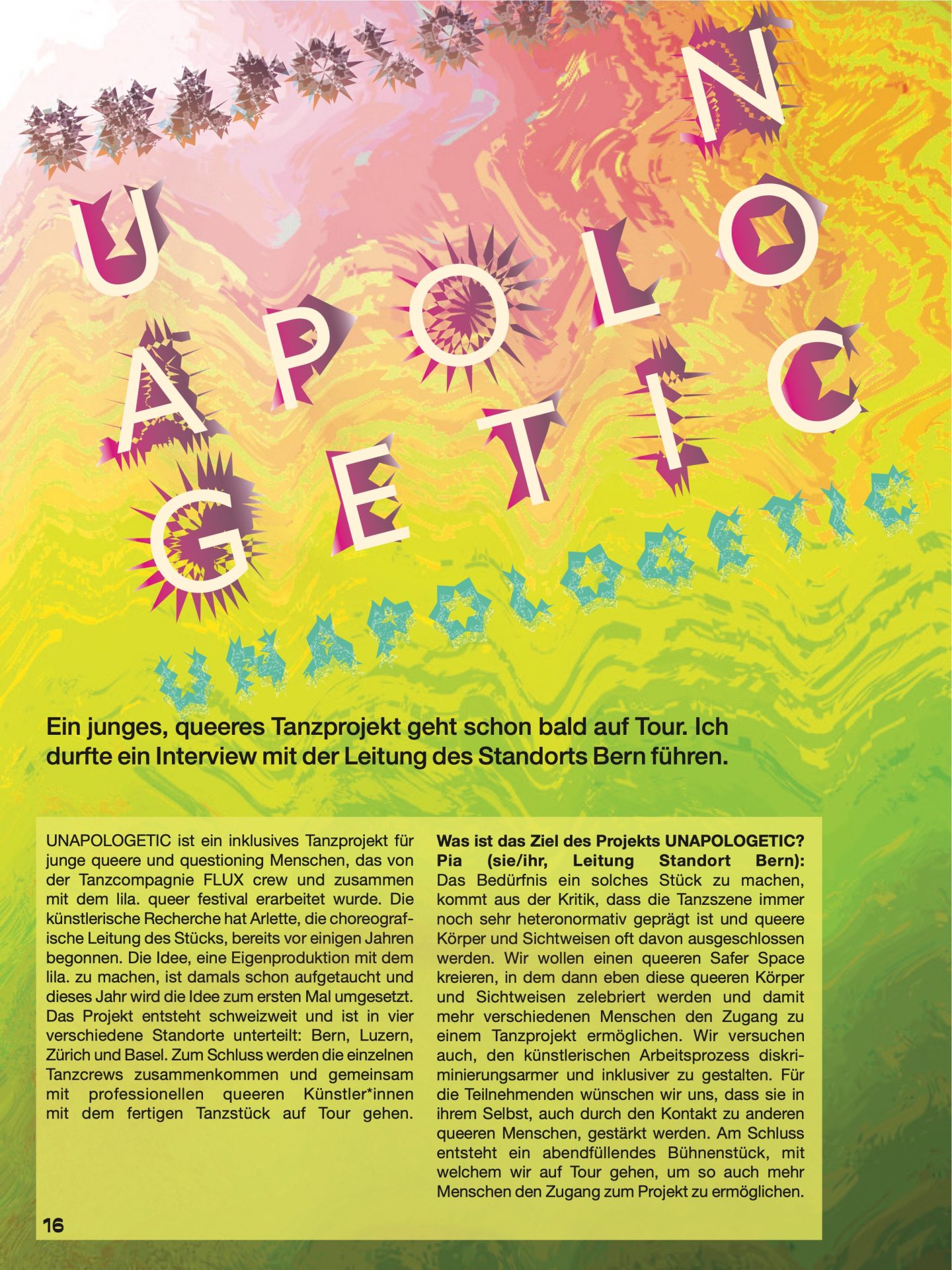 UNAPOLOGETIC ist ein inklusives Tanzprojekt für junge queere und questioning Menschen, das von der Tanzcompagnie FLUX crew und zusammen mit dem lila. queer festival erarbeitet wurde. Die künstlerische Recherche hat Arlette, die choreografische Leitung des Stücks, bereits vor einigen Jahren begonnen. Die Idee, eine Eigenproduktion mit dem lila. zu machen, ist damals schon aufgetaucht und dieses Jahr wird die Idee zum ersten Mal umgesetzt. Das Projekt entsteht schweizweit und ist in vier verschiedene Standorte unterteilt: Bern, Luzern, Zürich und Basel. Zum Schluss werden die einzelnen Tanzcrews zusammenkommen und gemeinsam mit professionellen queeren Künstler*innen mit dem fertigen Tanzstück auf Tour gehen.