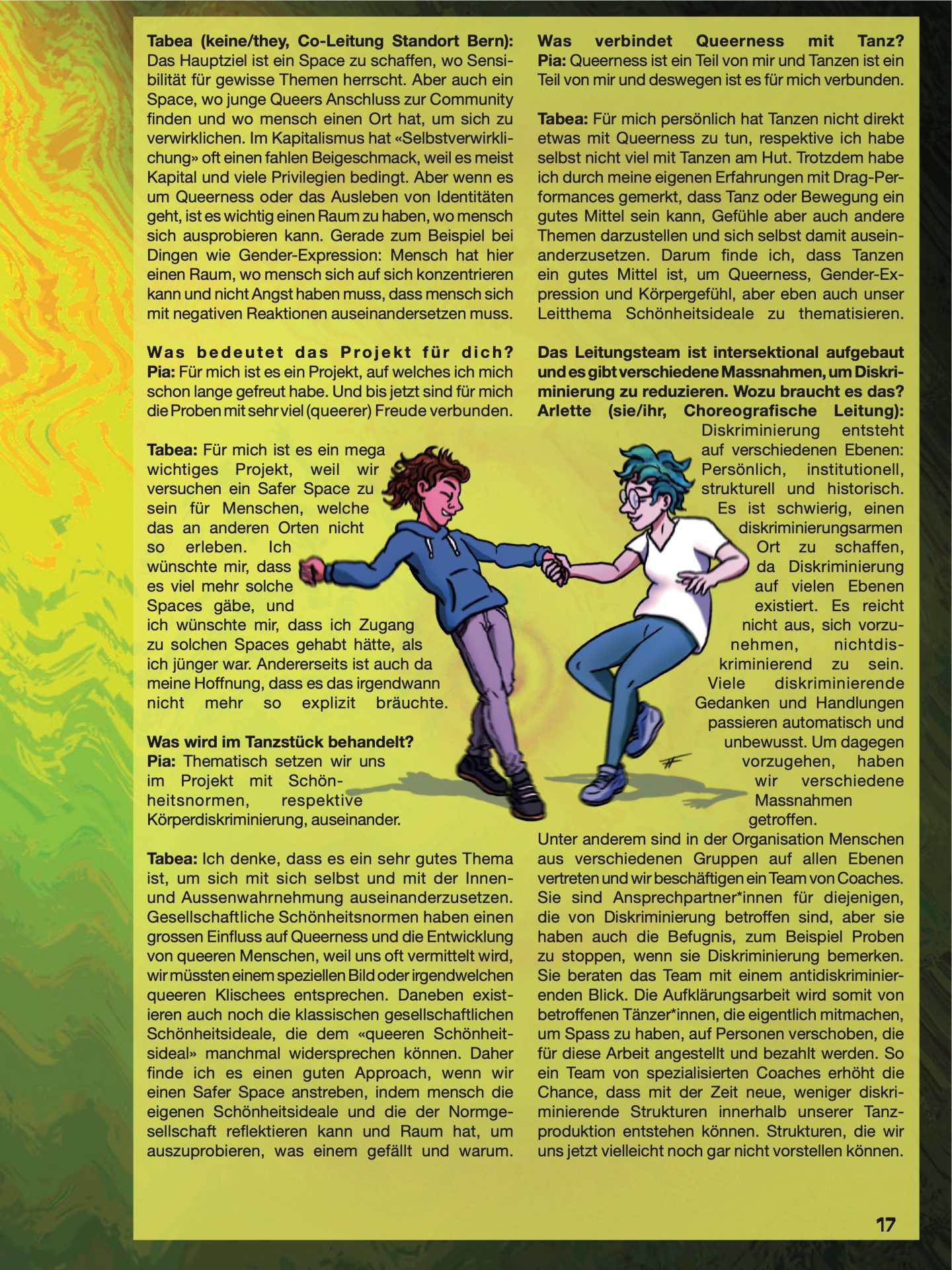 Das Leitungsteam ist intersektional aufgebaut und es gibt verschiedene Massnahmen, um Diskri- minierung zu reduzieren. Wozu braucht es das? Arlette (sie/ihr, Choreografische Leitung):