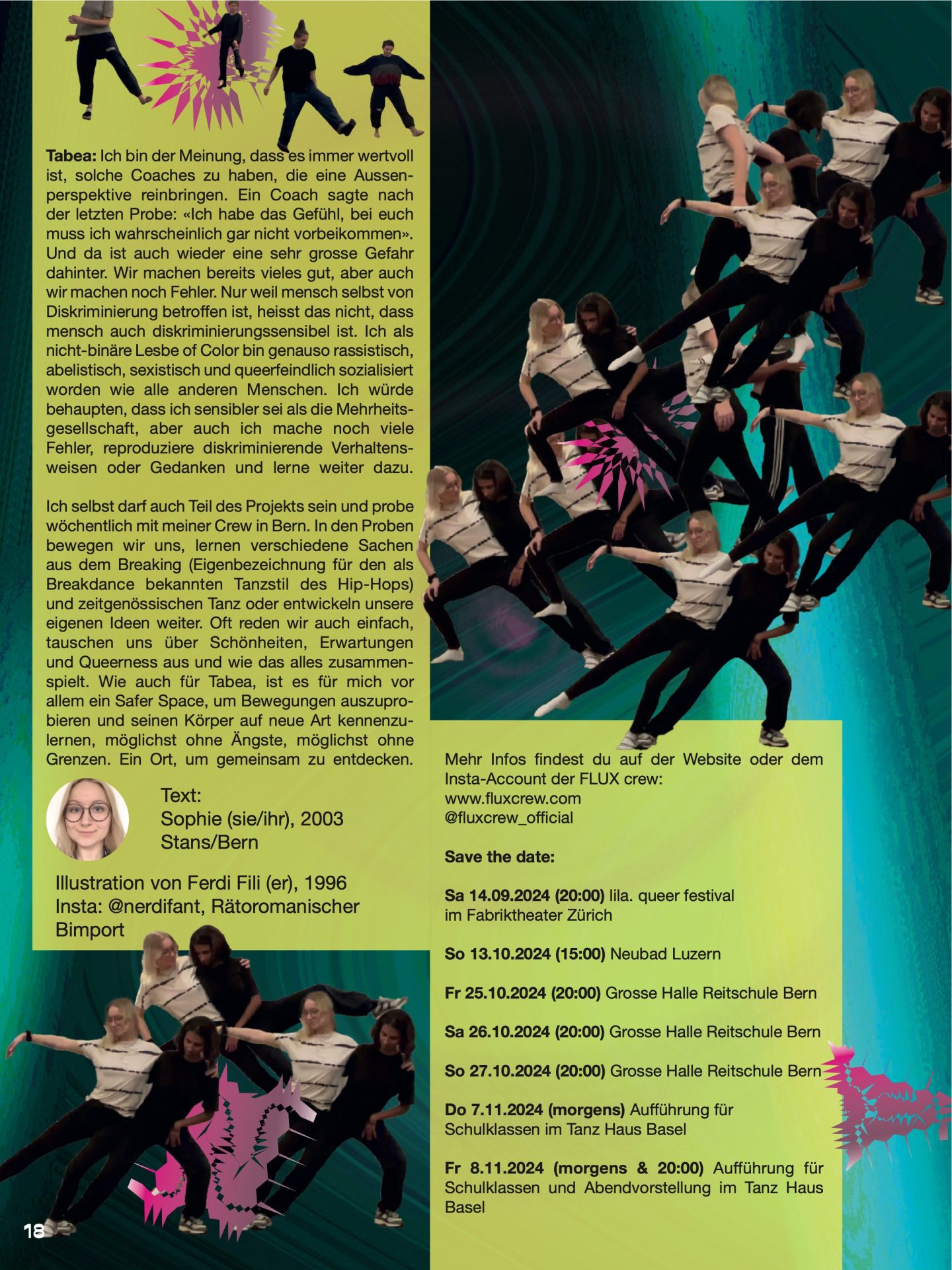 Ich selbst darf auch Teil des Projekts sein und probe wöchentlich mit meiner Crew in Bern. In den Proben bewegen wir uns, lernen verschiedene Sachen aus dem Breaking (Eigenbezeichnung für den als Breakdance bekannten Tanzstil des Hip-Hops) und zeitgenössischen Tanz oder entwickeln unsere eigenen Ideen weiter. Oft reden wir auch einfach, tauschen uns über Schönheiten, Erwartungen und Queerness aus und wie das alles zusammenspielt. Wie auch für Tabea, ist es für mich vor allem ein Safer Space, um Bewegungen auszuprobieren und seinen Körper auf neue Art kennenzulernen, möglichst ohne Ängste, möglichst ohne Grenzen. Ein Ort, um gemeinsam zu entdecken.