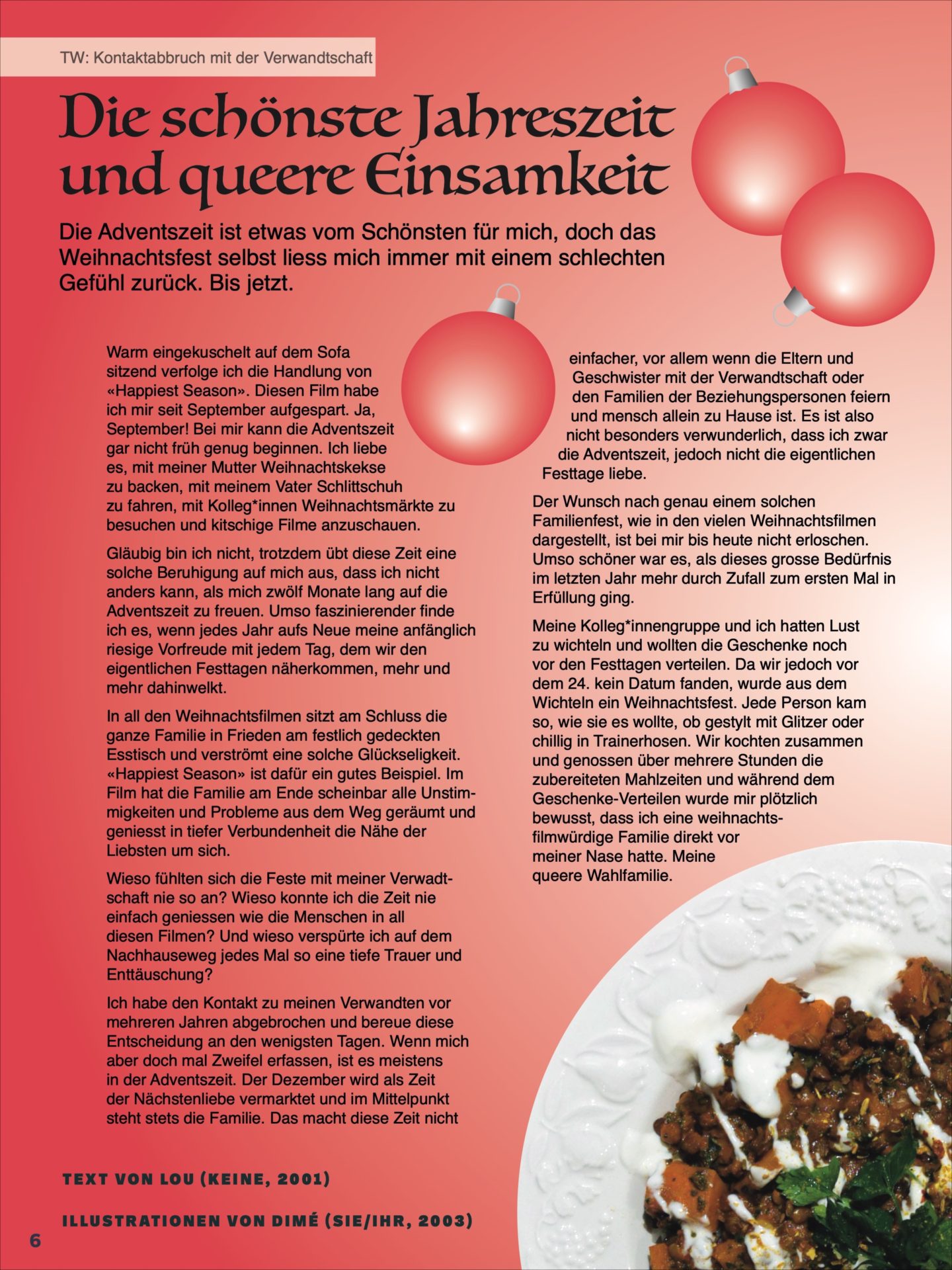 Meine Kolleg*innengruppe und ich hatten Lust zu wichteln und wollten die Geschenke noch vor den Festtagen verteilen. Da wir jedoch vor dem 24. kein Datum fanden, wurde aus dem Wichteln ein Weihnachtsfest. Jede Person kam so, wie sie es wollte, ob gestylt mit Glitzer oder chillig in Trainerhosen. Wir kochten zusammen und genossen über mehrere Stunden die zubereiteten Mahlzeiten und während dem Geschenke-Verteilen wurde mir plötzlich bewusst, dass ich eine weihnachtsfilmwürdige Familie direkt vor meiner Nase hatte. Meine queere Wahlfamilie.