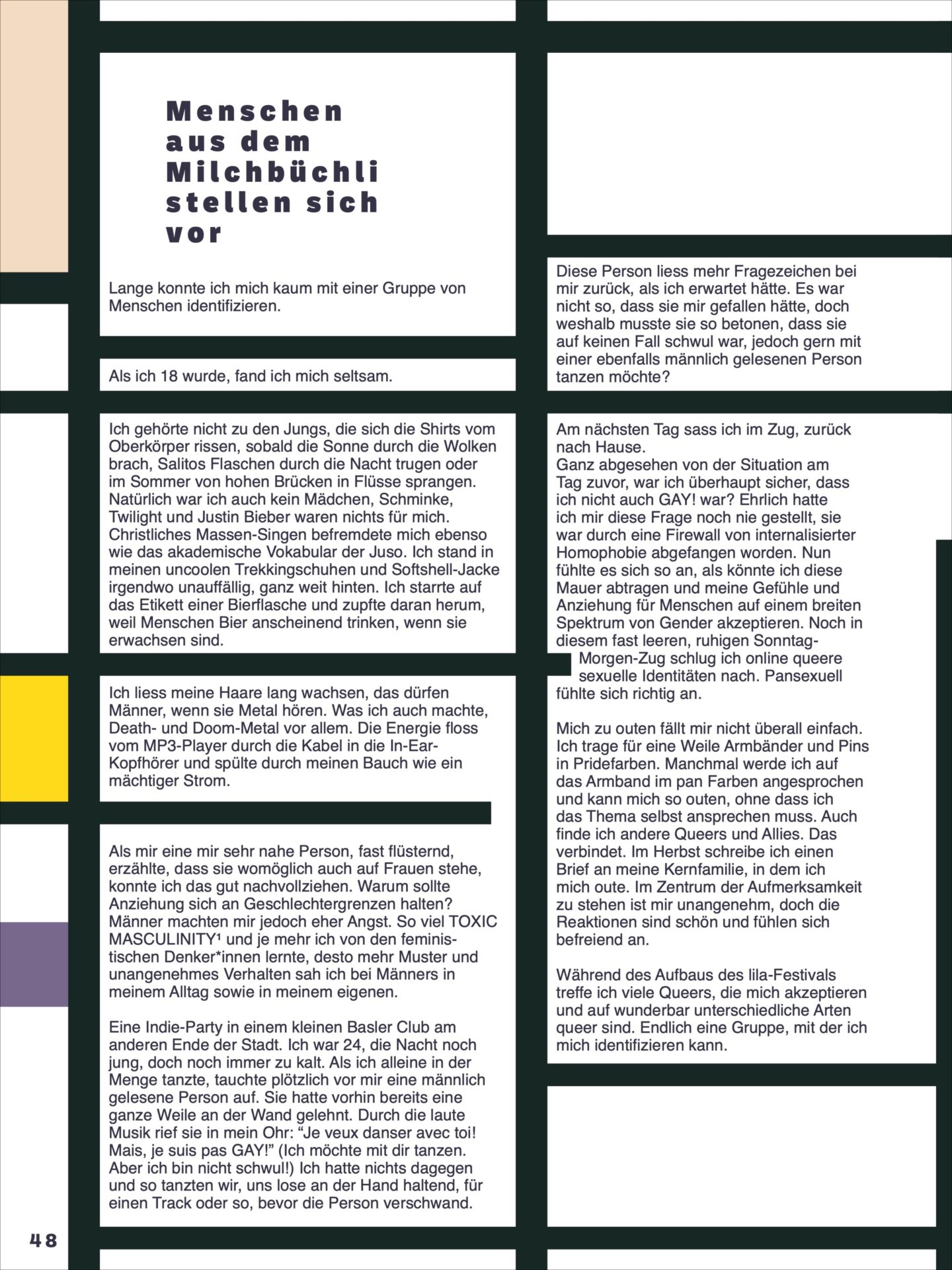 Eine Indie-Party in einem kleinen Basler Club am anderen Ende der Stadt. Ich war 24, die Nacht noch jung, doch noch immer zu kalt. Als ich alleine in der Menge tanzte, tauchte plötzlich vor mir eine männlich gelesene Person auf. Sie hatte vorhin bereits eine ganze Weile an der Wand gelehnt. Durch die laute Musik rief sie in mein Ohr: “Je veux danser avec toi! Mais, je suis pas GAY!” (Ich möchte mit dir tanzen. Aber ich bin nicht schwul!) Ich hatte nichts dagegen und so tanzten wir, uns lose an der Hand haltend, für einen Track oder so, bevor die Person verschwand.