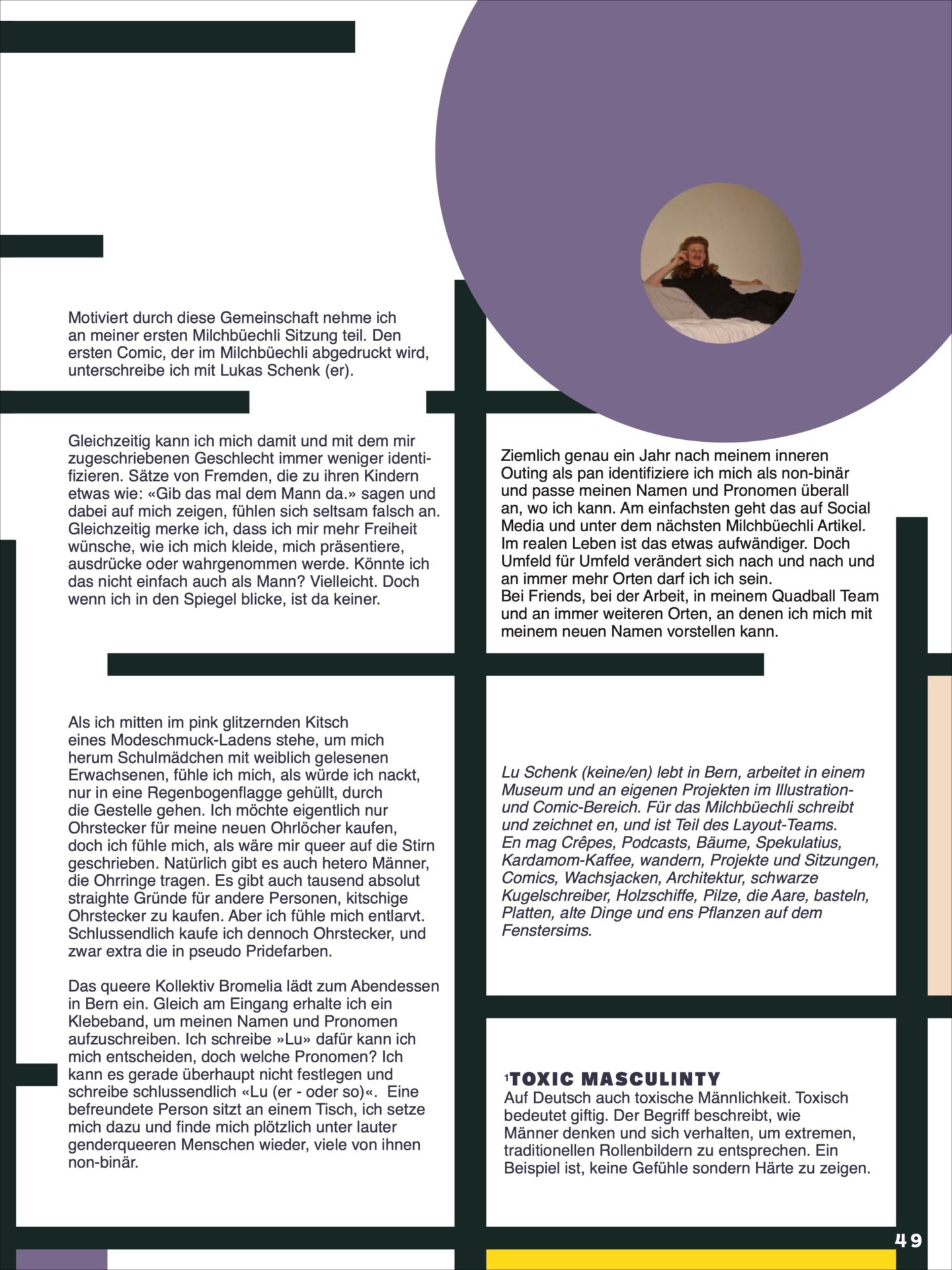 Lu Schenk (keine/en) lebt in Bern, arbeitet in einem Museum und an eigenen Projekten im Illustration-und Comic-Bereich. Für das Milchbüechli schreibt und zeichnet en, und ist Teil des Layout-Teams. En mag Crêpes, Podcasts, Bäume, Spekulatius, Kardamom-Kaffee, wandern, Projekte und Sitzungen, Comics, Wachsjacken, Architektur, schwarze Kugelschreiber, Holzschiffe, Pilze, die Aare, basteln, Platten, alte Dinge und ens Pfl anzen auf dem Fenstersims.