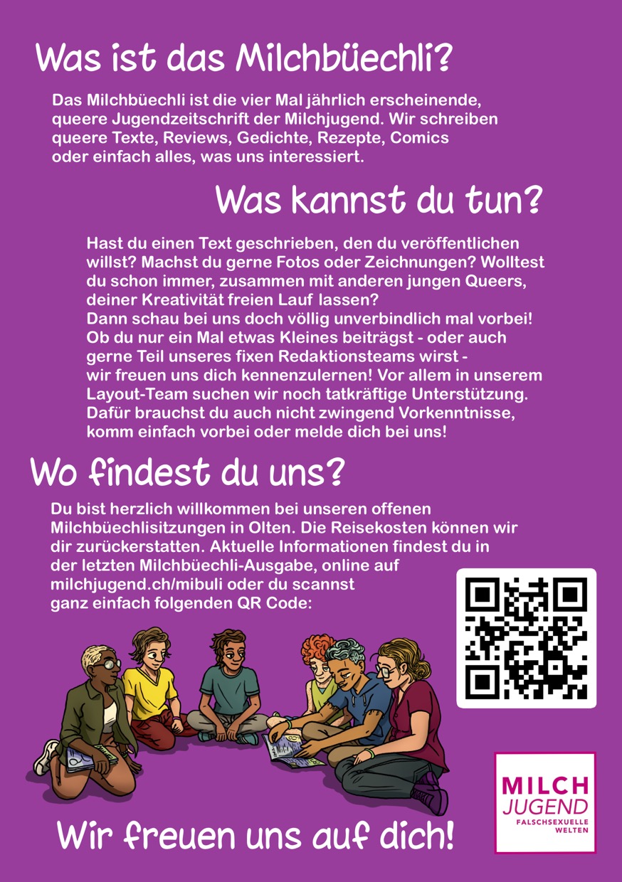 Das Milchbüechli ist die vier Mal jährlich erscheinende, queere Jugendzeitschrift der Milchjugend. Wir schreiben queere Texte, Reviews, Gedichte, Rezepte, Comics oder einfach alles, was uns interessiert.