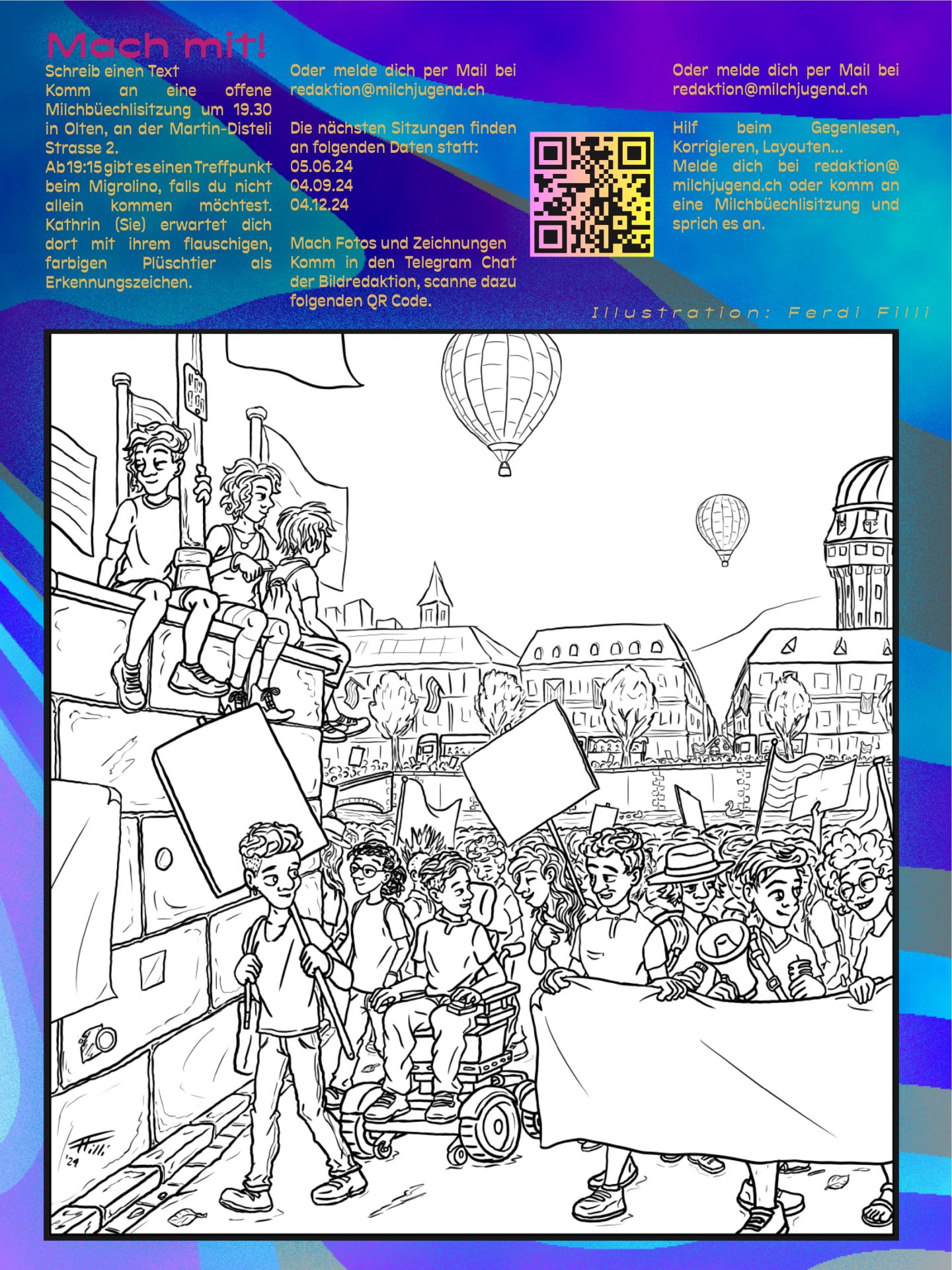 Mach Fotos und Zeichnungen Komm in den Telegram Chat der Bildredaktion, folge dem Link. Oder melde dich per Mail bei redaktion@milchjugend.ch