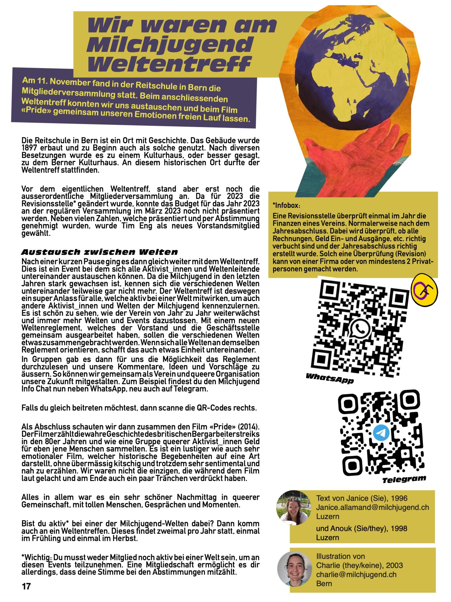 In Gruppen gab es dann für uns die Möglichkeit das Reglement durchzulesen und unsere Kommentare, Ideen und Vorschläge zu äussern. So können wir gemeinsam als Verein und queere Organisation unsere Zukunft mitgestalten. Zum Beispiel findest du den Milchjugend Info Chat nun neben WhatsApp, neu auch auf Telegram.