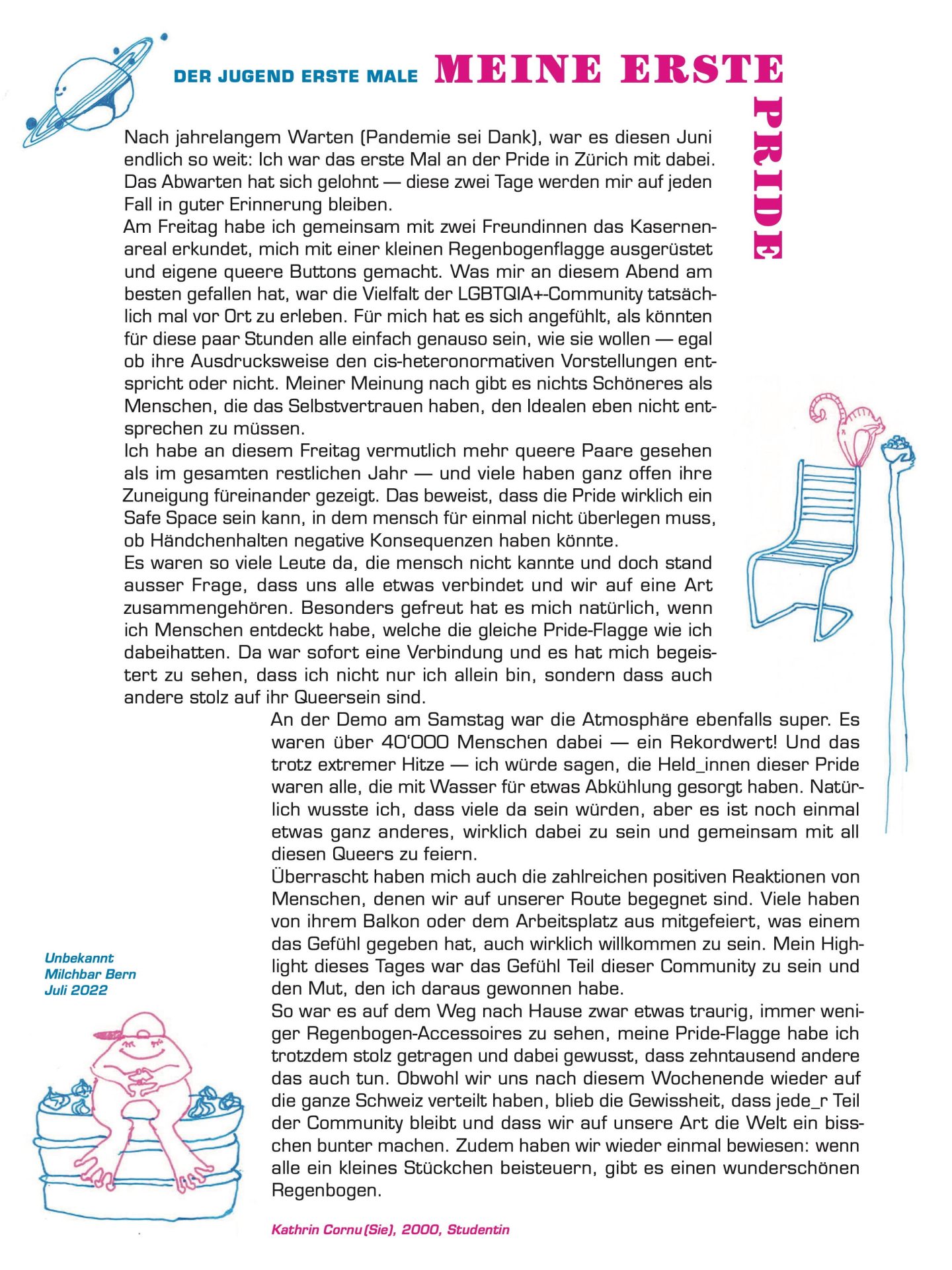 So war es auf dem Weg nach Hause zwar etwas traurig, immer weniger Regenbogen-Accessoires zu sehen, meine Pride-Flagge habe ich trotzdem stolz getragen und dabei gewusst, dass zehntausend andere das auch tun. Obwohl wir uns nach diesem Wochenende wieder auf die ganze Schweiz verteilt haben, blieb die Gewissheit, dass jede_r Teil der Community bleibt und dass wir auf unsere Art die Welt ein bisschen bunter machen. Zudem haben wir wieder einmal bewiesen: wenn alle ein kleines Stückchen beisteuern, gibt es einen wunderschönen Regenbogen.