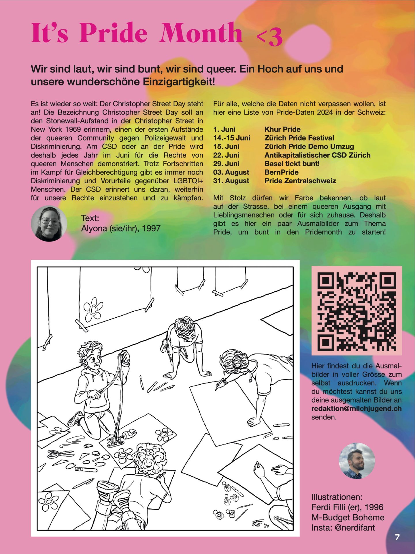Mit Stolz dürfen wir Farbe bekennen, ob laut auf der Strasse, bei einem queeren Ausgang mit Lieblingsmenschen oder für sich zuhause. Deshalb gibt es hier ein paar Ausmalbilder zum Thema Pride, um bunt in den Pridemonth zu starten!
