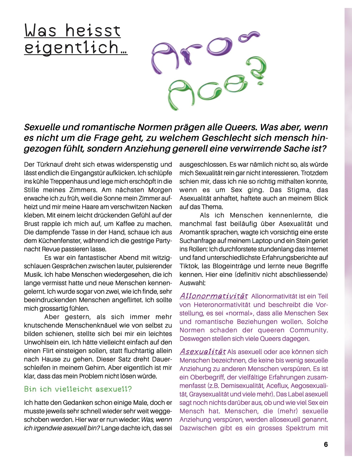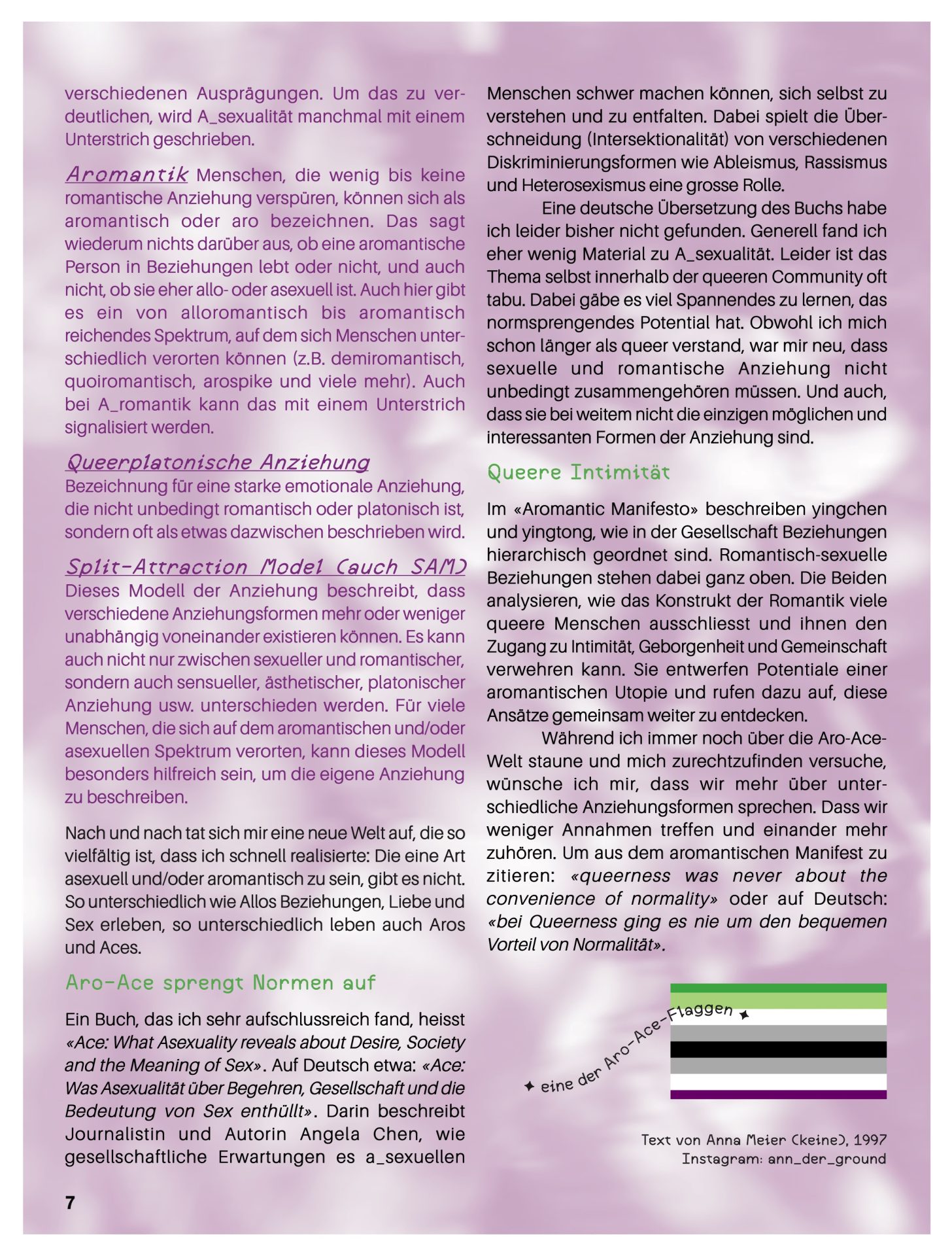 Während ich immer noch über die Aro-Ace-Welt staune und mich zurechtzufinden versuche, wünsche ich mir, dass wir mehr über unterschiedliche Anziehungsformen sprechen. Dass wir weniger Annahmen treffen und einander mehr zuhören. Um aus dem aromantischen Manifest zu zitieren: «queerness was never about the convenience of normality» oder auf Deutsch: «bei Queerness ging es nie um den bequemen Vorteil von Normalität».