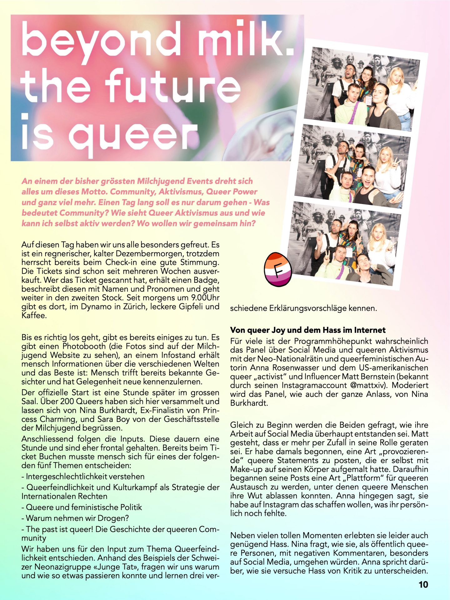 Für viele ist der Programmhöhepunkt wahrscheinlich das Panel über Social Media und queeren Aktivismus mit der Neo-Nationalrätin und queerfeministischen Autorin Anna Rosenwasser und dem US-amerikanischen queer „activist“ und Influencer Matt Bernstein (bekannt durch seinen Instagramaccount @mattxiv). Moderiert wird das Panel, wie auch der ganze Anlass, von Nina Burkhardt.