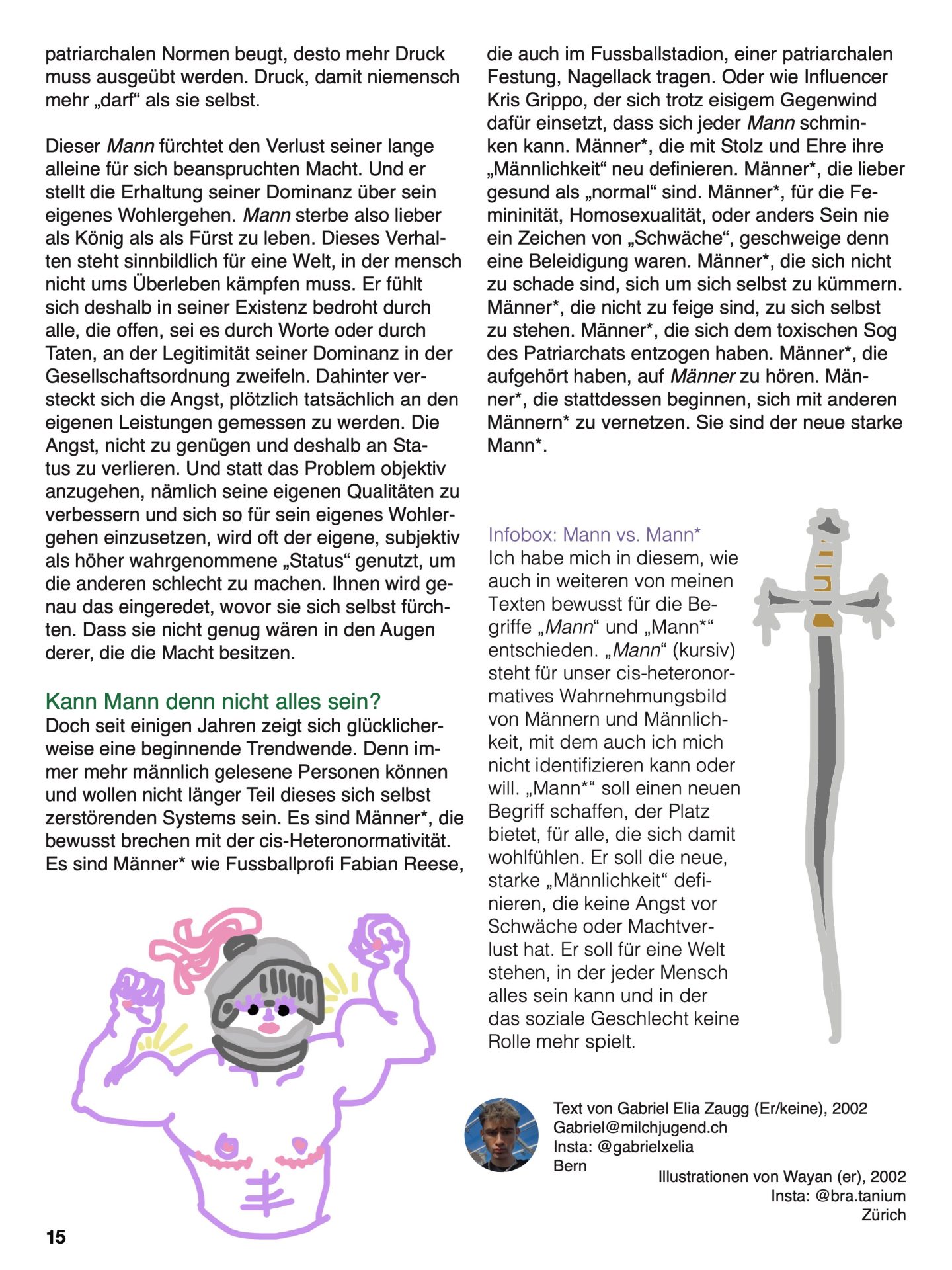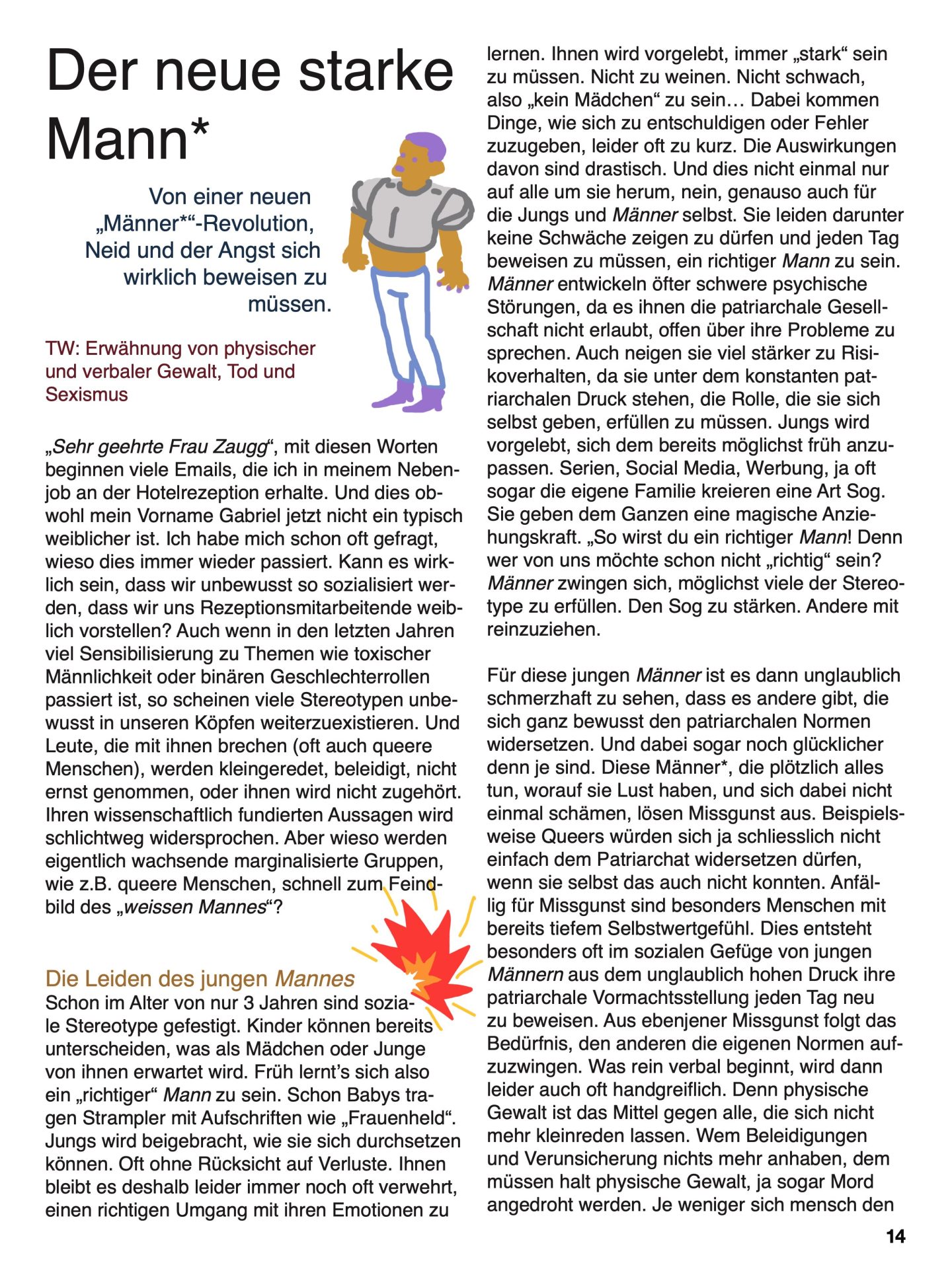 Ich habe mich in diesem, wie auch in weiteren von meinen Texten bewusst für die Begriffe „Mann“ und „Mann*“ entschieden. „Mann“ (kursiv) steht für unser cis-heteronormatives Wahrnehmungsbild von Männern und Männlichkeit, mit dem auch ich mich nicht identifizieren kann oder will. „Mann*“ soll einen neuen Begriff schaffen, der Platz bietet, für alle, die sich damit wohlfühlen. Er soll die neue, starke „Männlichkeit“ definieren, die keine Angst vor Schwäche oder Machtverlust hat. Er soll für eine Welt stehen, in der jeder Mensch alles sein kann und in der das soziale Geschlecht keine Rolle mehr spielt.