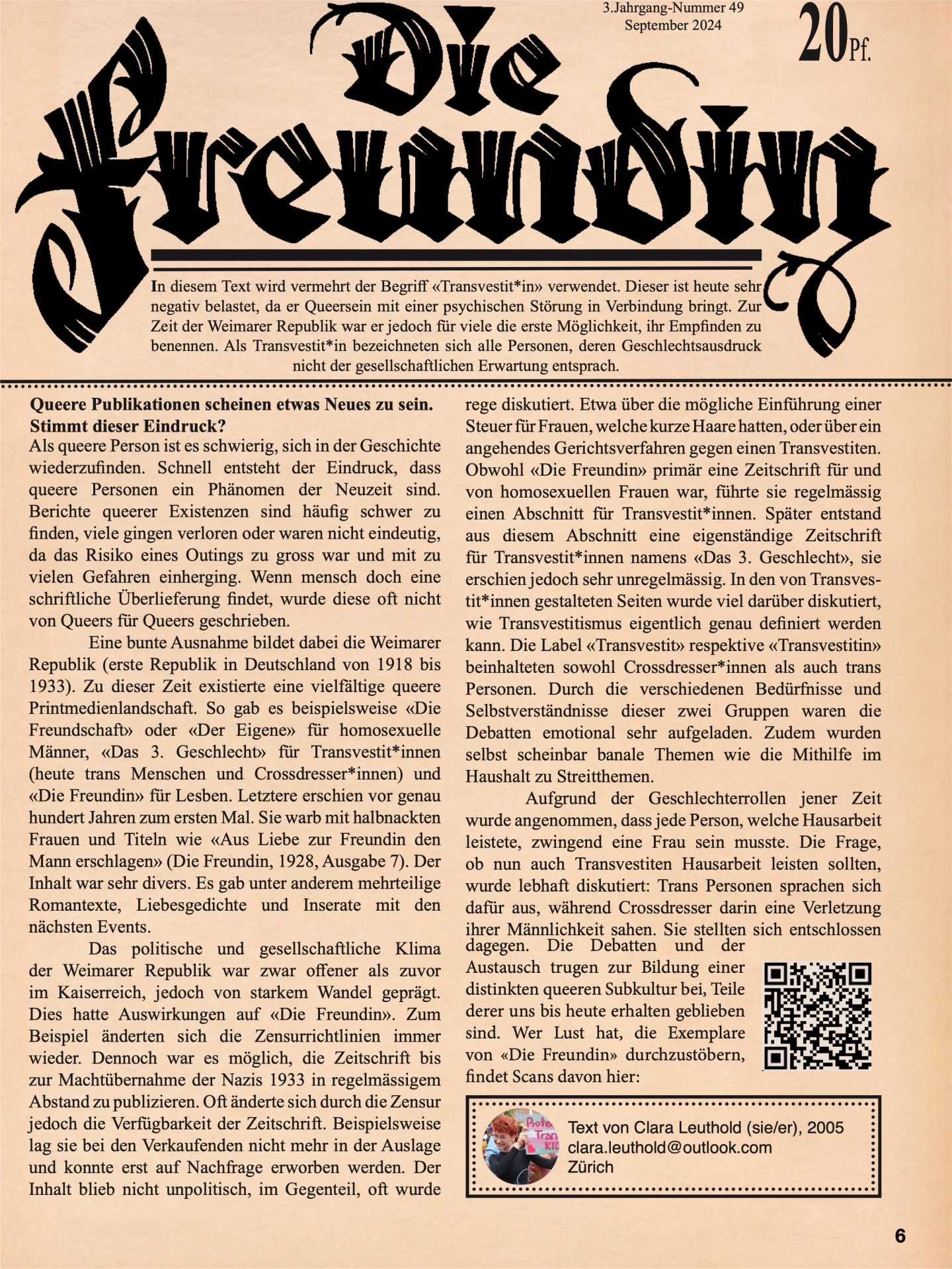 Eine bunte Ausnahme bildet dabei die Weimarer Republik (erste Republik in Deutschland von 1918 bis 1933). Zu dieser Zeit existierte eine vielfältige queere Printmedienlandschaft. So gab es beispielsweise «Die Freundschaft» oder «Der Eigene» für homosexuelle Männer, «Das 3. Geschlecht» für Transvestit*innen (heute trans Menschen und Crossdresser*innen) und «Die Freundin» für Lesben. Letztere erschien vor genau hundert Jahren zum ersten Mal. Sie warb mit halbnackten Frauen und Titeln wie «Aus Liebe zur Freundin den Mann erschlagen» (Die Freundin, 1928, Ausgabe 7). Der Inhalt war sehr divers. Es gab unter anderem mehrteilige Romantexte, Liebesgedichte und Inserate mit den nächsten Events.