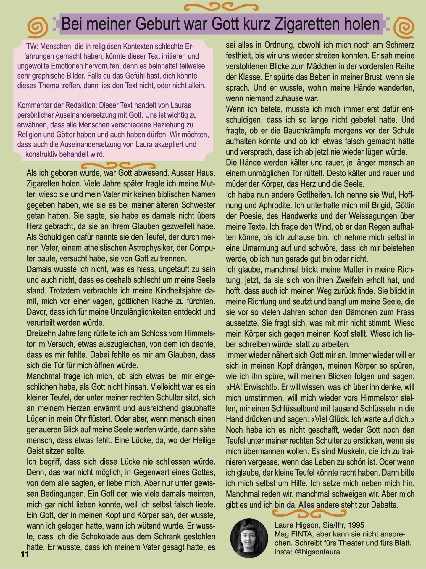 Kommentar der Redaktion: Dieser Text handelt von Lauras persönlicher Auseinandersetzung mit Gott. Uns ist wichtig zu erwähnen, dass alle Menschen verschiedene Beziehung zu Religion und Götter haben und auch haben dürfen. Wir möchten, dass auch die Auseinandersetzung von Laura akzeptiert und konstruktiv behandelt wird.