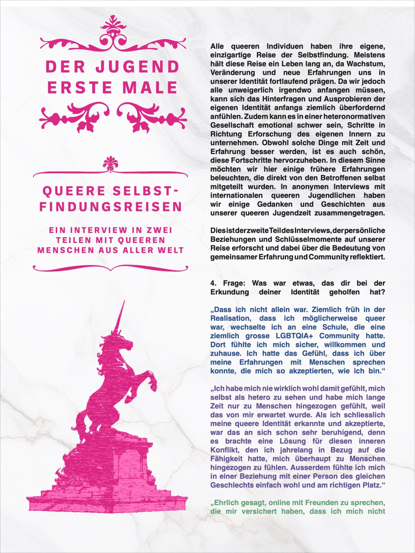 Alle queeren Individuen haben ihre eigene, einzigartige Reise der Selbstfindung. Meistens hält diese Reise ein Leben lang an, da Wachstum, Veränderung und neue Erfahrungen uns in unserer Identität fortlaufend prägen. Da wir jedoch alle unweigerlich irgendwo anfangen müssen, kann sich das Hinterfragen und Ausprobieren der eigenen Identität anfangs ziemlich überfordernd anfühlen. Zudem kann es in einer heteronormativen Gesellschaft emotional schwer sein, Schritte in Richtung Erforschung des eigenen Innern zu unternehmen. Obwohl solche Dinge mit Zeit und Erfahrung besser werden, ist es auch schön, diese Fortschritte hervorzuheben. In diesem Sinne möchten wir hier einige frühere Erfahrungen beleuchten, die direkt von den Betroffenen selbst mitgeteilt wurden. In anonymen Interviews mit internationalen queeren Jugendlichen haben wir einige Gedanken und Geschichten aus unserer queeren Jugendzeit zusammengetragen.