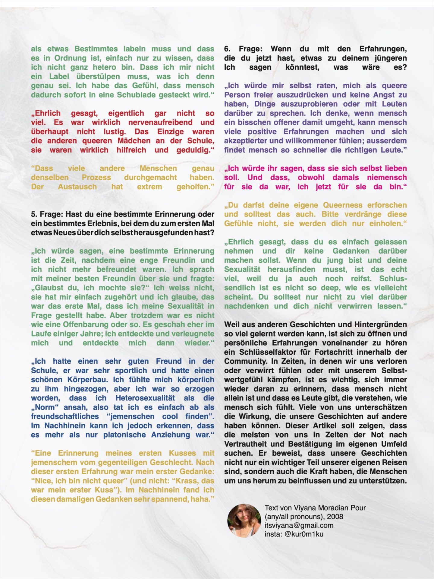 „Ich würde mir selbst raten, mich als queere Person freier auszudrücken und keine Angst zu haben, Dinge auszuprobieren oder mit Leuten darüber zu sprechen. Ich denke, wenn mensch ein bisschen offener damit umgeht, kann mensch viele positive Erfahrungen machen und sich akzeptierter und willkommener fühlen; ausserdem findet mensch so schneller die richtigen Leute.”