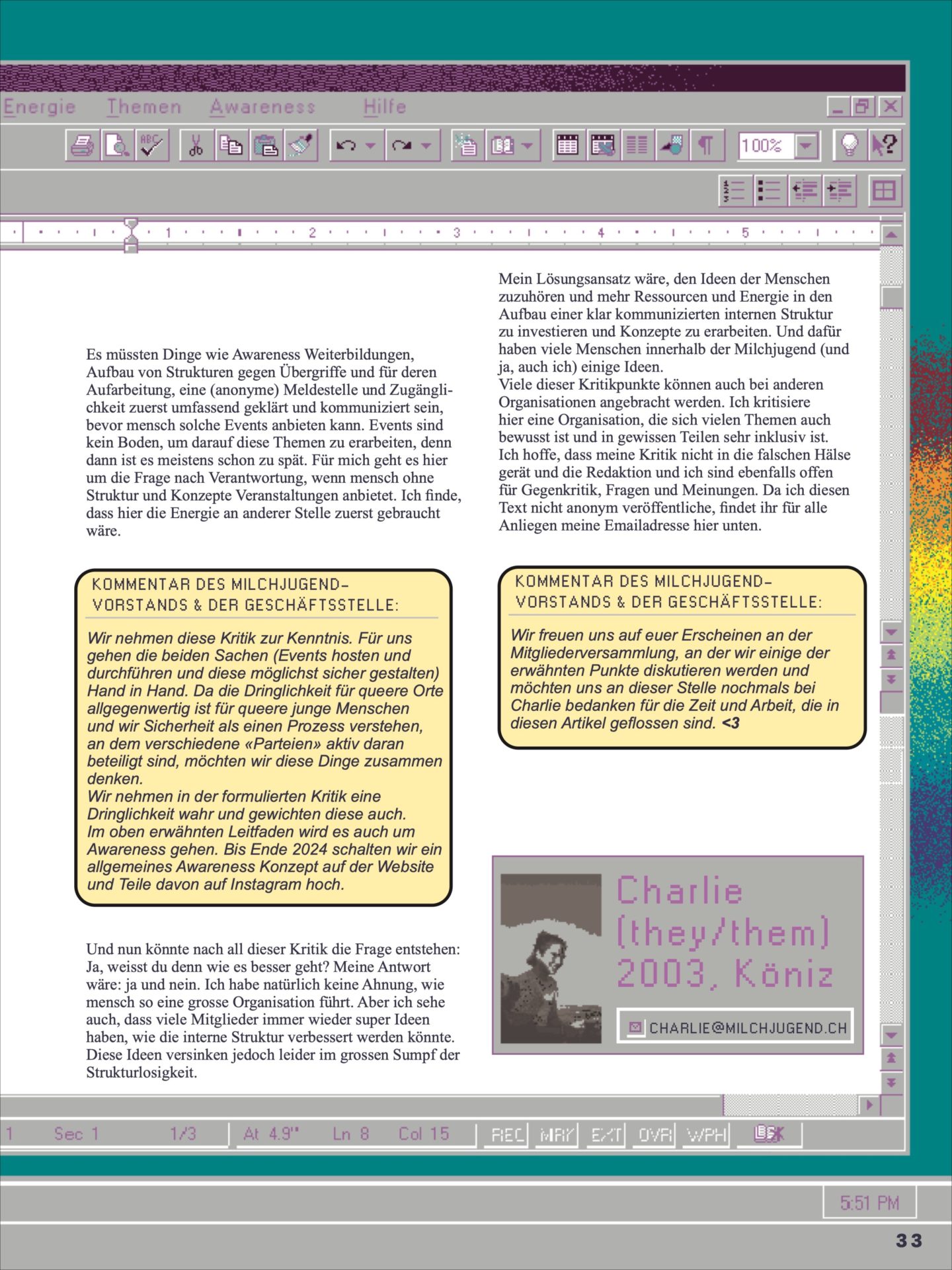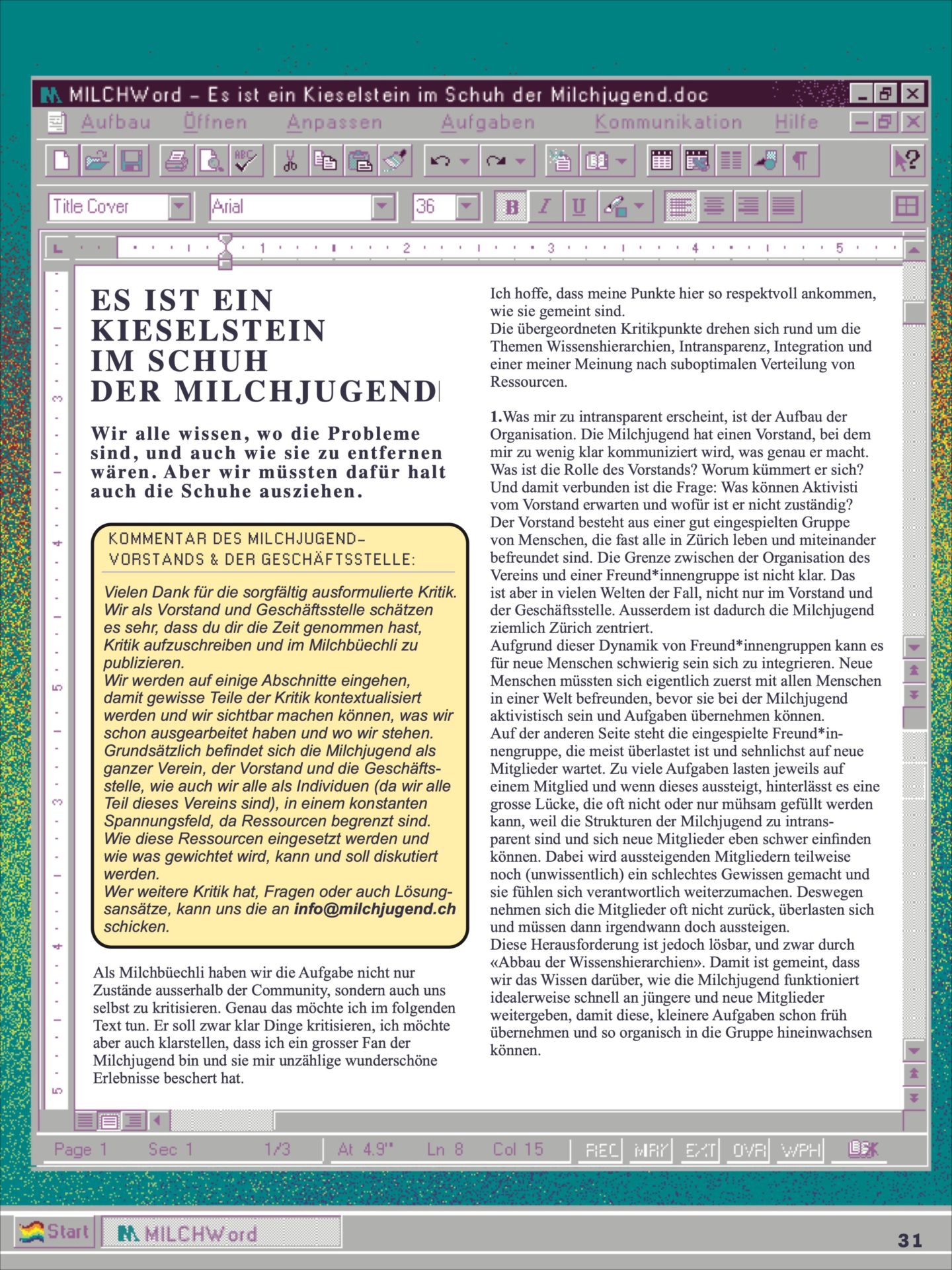 Vielen Dank für die sorgfältig ausformulierte Kritik. Wir als Vorstand und Geschäftsstelle schätzen es sehr, dass du dir die Zeit genommen hast, Kritik aufzuschreiben und im Milchbüechli zu publizieren. Wir werden auf einige Abschnitte eingehen, damit gewisse Teile der Kritik kontextualisiert werden und wir sichtbar machen können, was wir schon ausgearbeitet haben und wo wir stehen. Grundsätzlich befindet sich die Milchjugend als ganzer Verein, der Vorstand und die Geschäftsstelle, wie auch wir alle als Individuen (da wir alle Teil dieses Vereins sind), in einem konstanten Spannungsfeld, da Ressourcen begrenzt sind. Wie diese Ressourcen eingesetzt werden und wie was gewichtet wird, kann und soll diskutiert werden. Wer weitere Kritik hat, Fragen oder auch Lösungsansätze, kann uns die an info@milchjugend.ch schicken.
