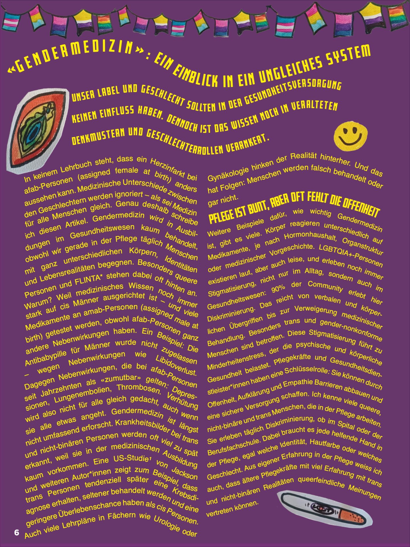 Weitere Beispiele dafür, wie wichtig Gendermedizin ist, gibt es viele. Körper reagieren unterschiedlich auf Medikamente, je nach Hormonhaushalt, Organstruktur oder medizinischer Vorgeschichte. LGBTQIA+-Personen existieren laut, aber auch leise, und erleben noch immer Stigmatisierung, nicht nur im Alltag, sondern auch im Gesundheitswesen: 90% der Community erlebt hier Diskriminierung. Das reicht von verbalen und körperlichen Übergriffen bis zur Verweigerung medizinischer Behandlung. Besonders trans und gender-nonkonforme Menschen sind betroffen. Diese Stigmatisierung führt zu Minderheitenstress, der die psychische und körperliche Gesundheit belastet. Pflegekräfte und Gesundheitsdienstleister*innen haben eine Schlüsselrolle: Sie können durch Offenheit, Aufklärung und Empathie Barrieren abbauen und eine sichere Versorgung schaffen. Ich kenne viele queere, nicht-binäre und trans Menschen, die in der Pflege arbeiten. Sie erleben täglich Diskriminierung, ob im Spital oder der Berufsfachschule. Dabei braucht es jede helfende Hand in der Pflege, egal welche Identität, Hautfarbe oder welches Geschlecht. Aus eigener Erfahrung in der Pflege weiss ich auch, dass ältere Pflegekräfte mit viel Erfahrung mit trans und nicht-binären Realitäten queerfeindliche Meinungen vertreten können.