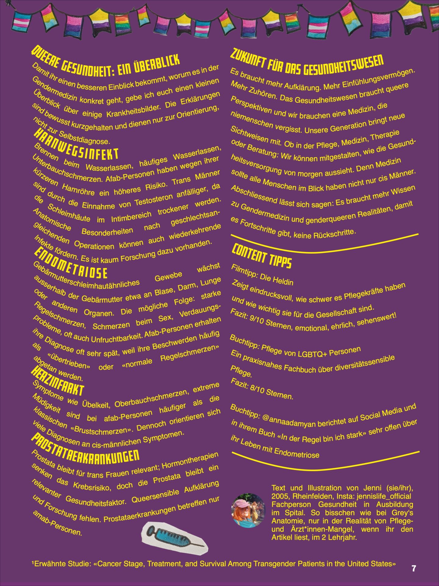 Es braucht mehr Aufklärung. Mehr Einfühlungsvermögen. Mehr Zuhören. Das Gesundheitswesen braucht queere Perspektiven und wir brauchen eine Medizin, die niemenschen vergisst. Unsere Generation bringt neue Sichtweisen mit. Ob in der Pflege, Medizin, Therapie oder Beratung: Wir können mitgestalten, wie die Gesundheitsversorgung von morgen aussieht. Denn Medizin sollte alle Menschen im Blick haben, nicht nur cis Männer. Abschliessend lässt sich sagen: Es braucht mehr Wissen zu Gendermedizin und genderqueeren Realitäten, damit es Fortschritte gibt, keine Rückschritte.