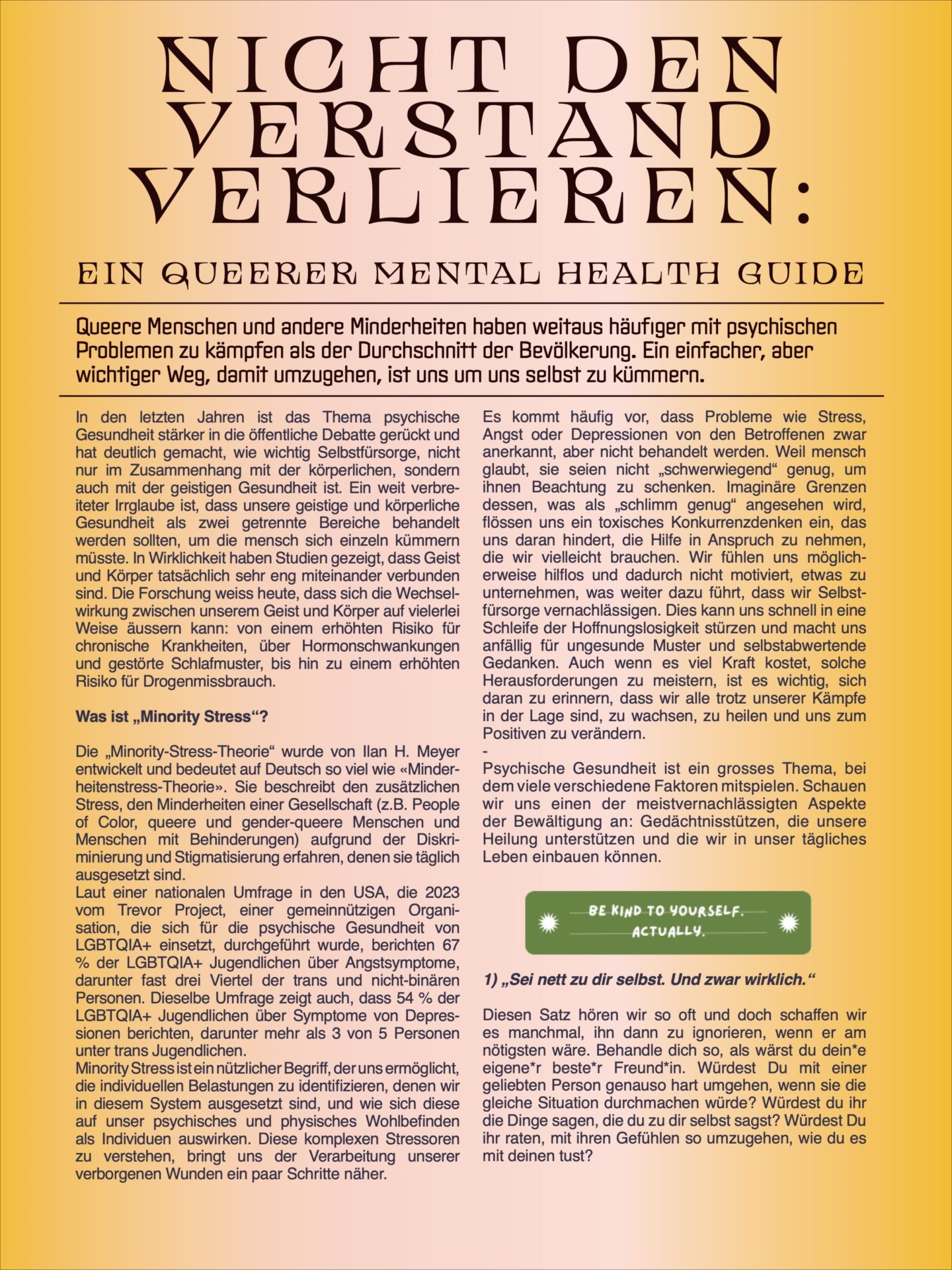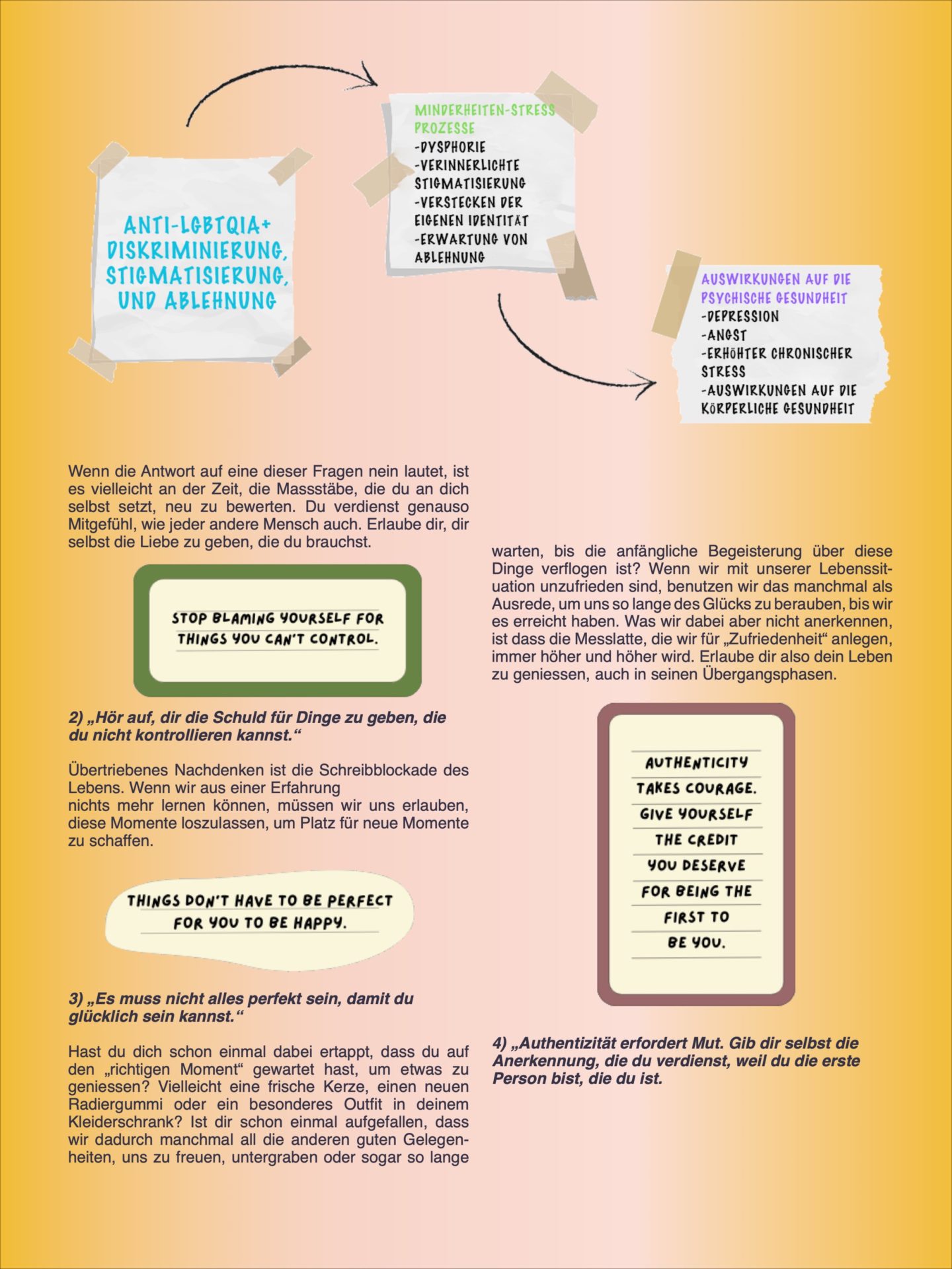 Minority Stress ist ein nützlicher Begriff, der uns ermöglicht, die individuellen Belastungen zu identifizieren, denen wir in diesem System ausgesetzt sind, und wie sich diese auf unser psychisches und physisches Wohlbefinden als Individuen auswirken. Diese komplexen Stressoren zu verstehen, bringt uns der Verarbeitung unserer verborgenen Wunden ein paar Schritte näher.