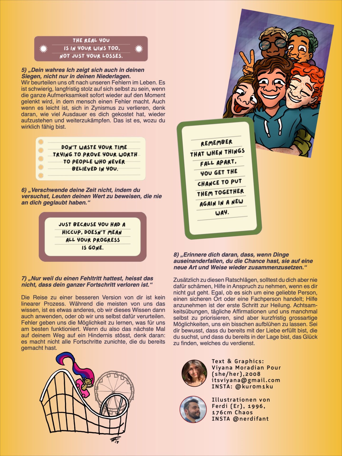 Wir beurteilen uns oft nach unseren Fehlern im Leben. Es ist schwierig, langfristig stolz auf sich selbst zu sein, wenn die ganze Aufmerksamkeit sofort wieder auf den Moment gelenkt wird, in dem mensch einen Fehler macht. Auch wenn es leicht ist, sich in Zynismus zu verlieren, denk daran, wie viel Ausdauer es dich gekostet hat, wieder aufzustehen und weiterzukämpfen. Das ist es, wozu du wirklich fähig bist.
