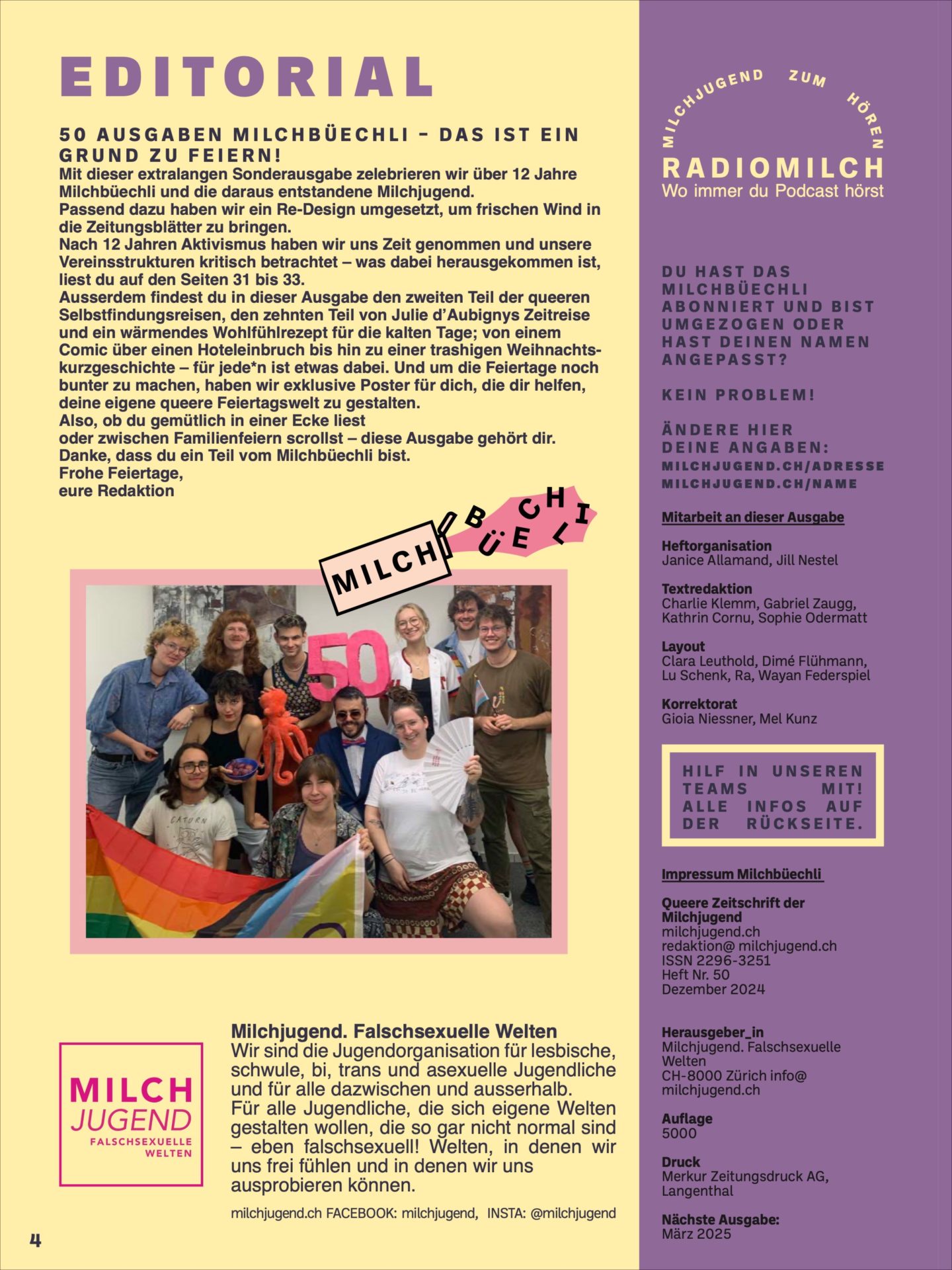 Mit dieser extralangen Sonderausgabe zelebrieren wir über 12 Jahre Milchbüechli und die daraus entstandene Milchjugend. Passend dazu haben wir ein Re-Design umgesetzt, um frischen Wind in die Zeitungsblätter zu bringen.